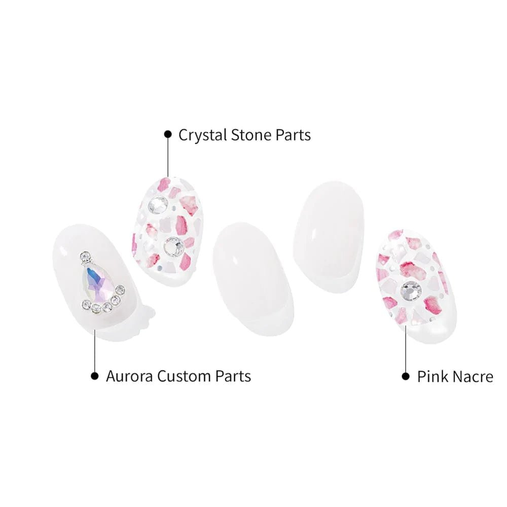 A premium manicure fit for a queen. This luxurious design features ivory white gel, silver foil flakes, pink and white pearl decals, and sparkly, custom-made gemstones.
