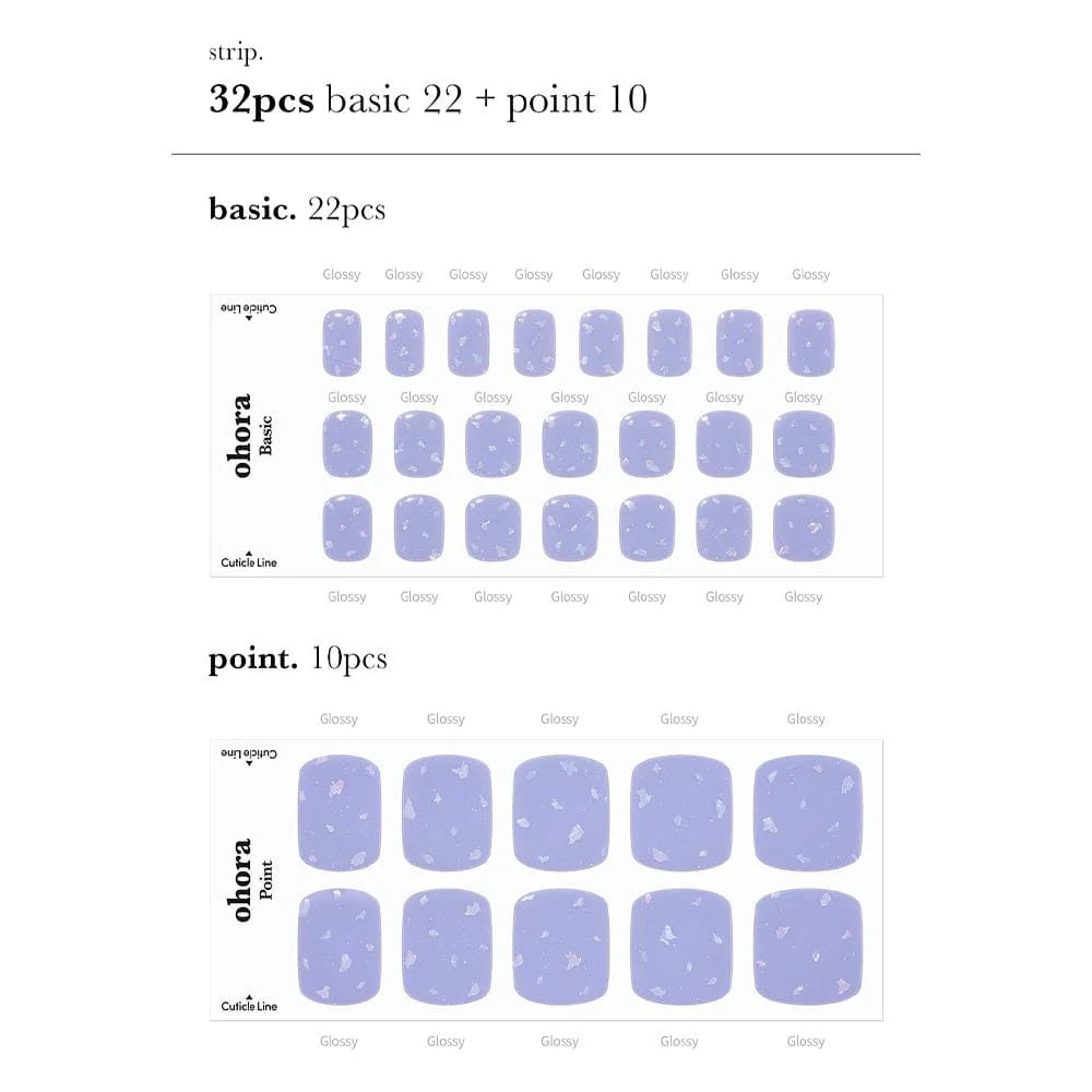 An alluring pedicure reminiscent of shells and pearls scattered along the sand. Features dreamy purple gel topped with a fine pink shimmer and larger pieces of glass glitter.