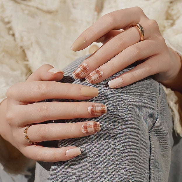 Wrap your fingertips in fall comfort with N Cozy Plaid. This stylish set pairs warm beige and creamy tones with a beautifully textured brown plaid — the kind that instantly gives “pumpkin spice, denim days, and soft knits” energy.
